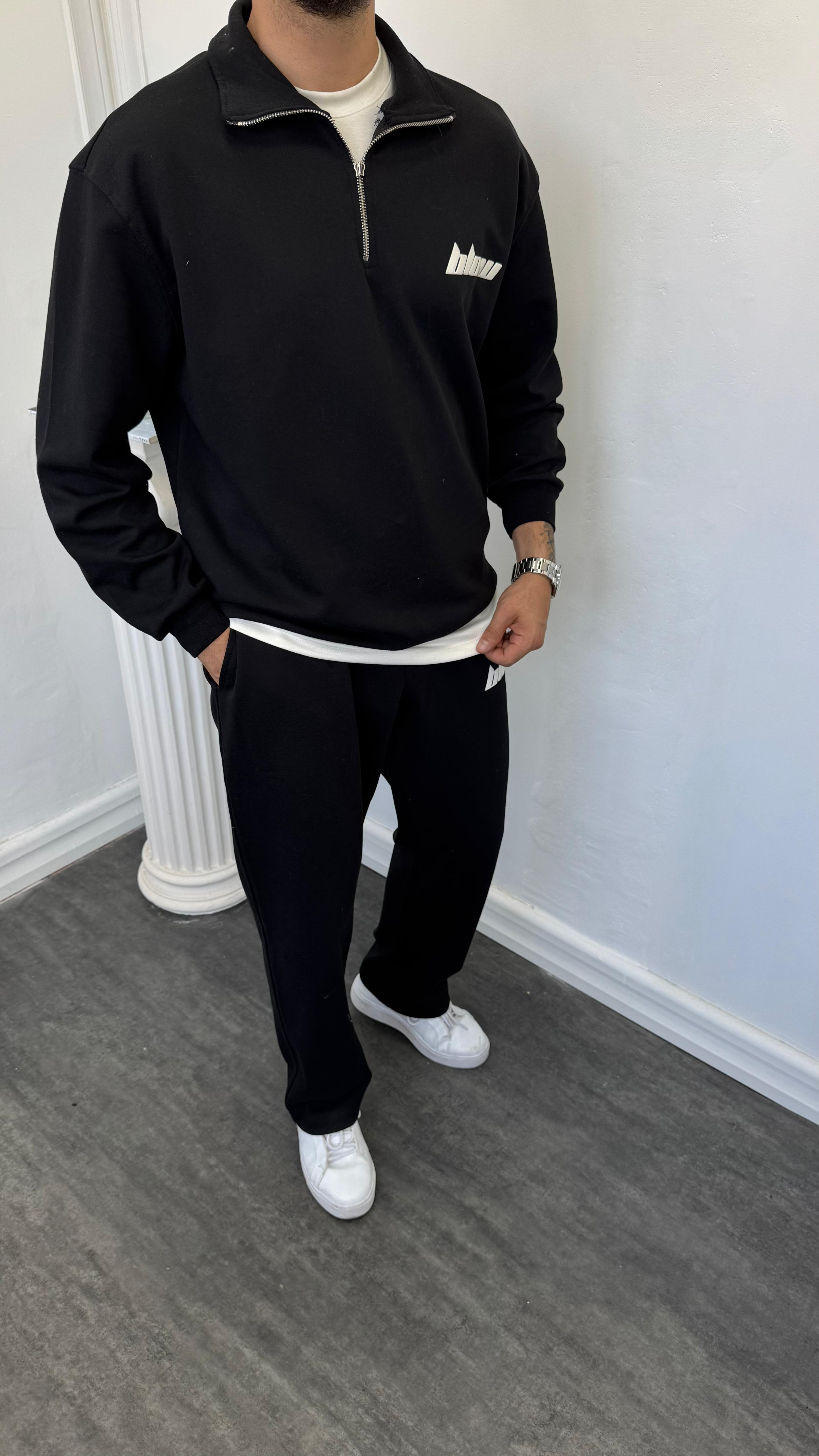Double Face Yarım Fermuarlı Oversize Takım Siyah