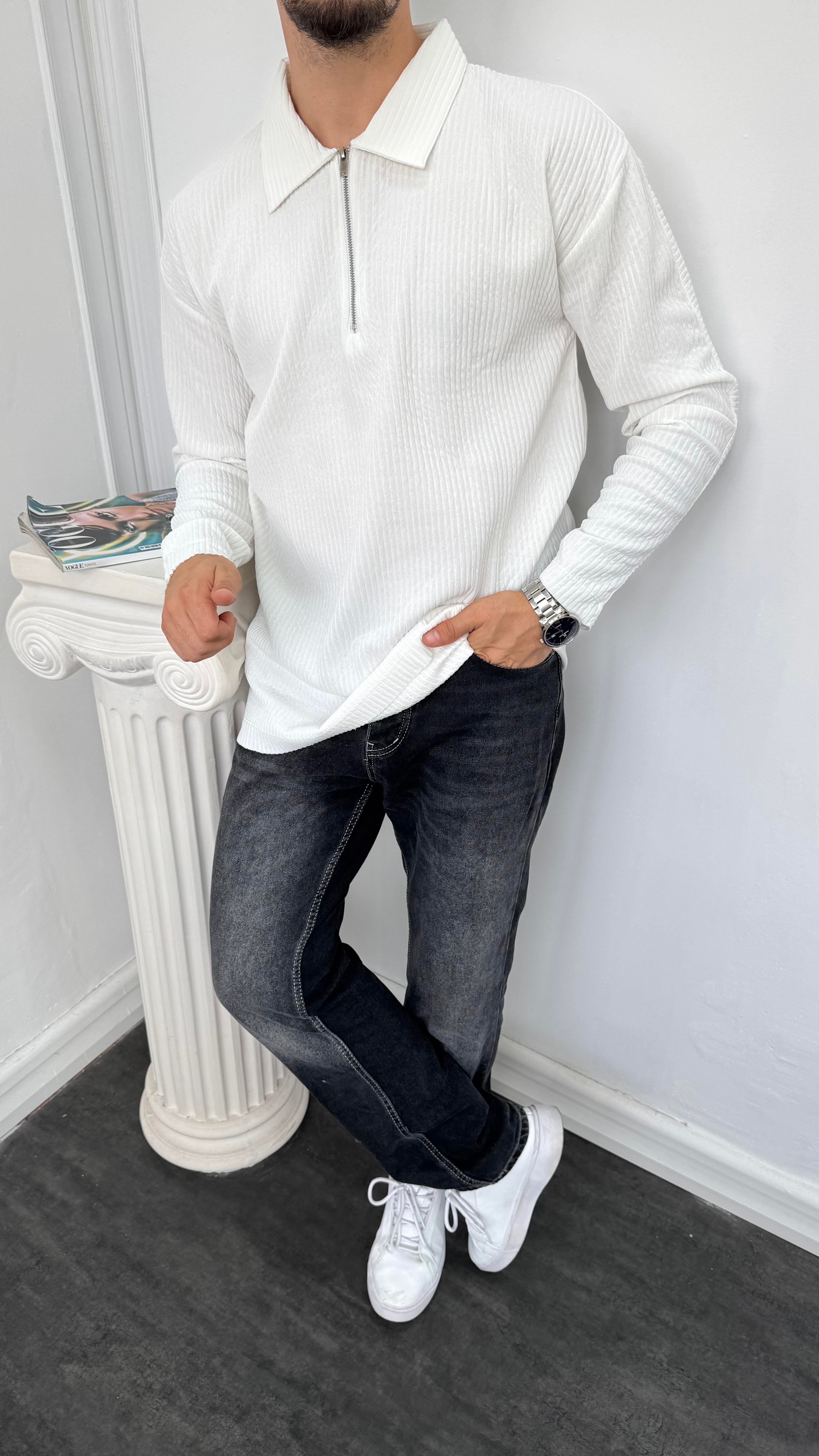 Fitilli Yarım Fermuarlı Sweatshirt Beyaz