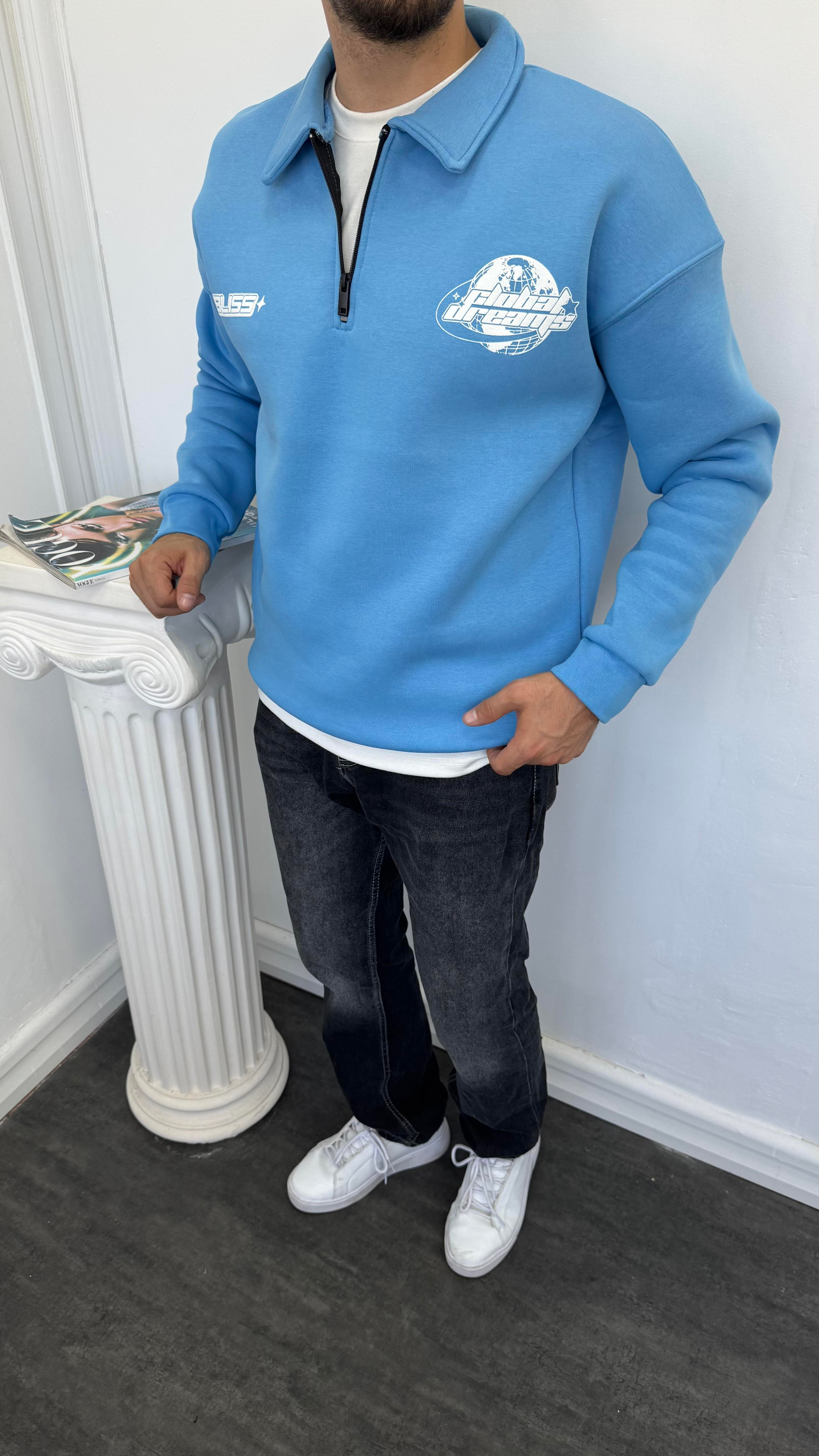 Polo Yaka Fermuarlı Şardonlu Sweatshirt B.mavi