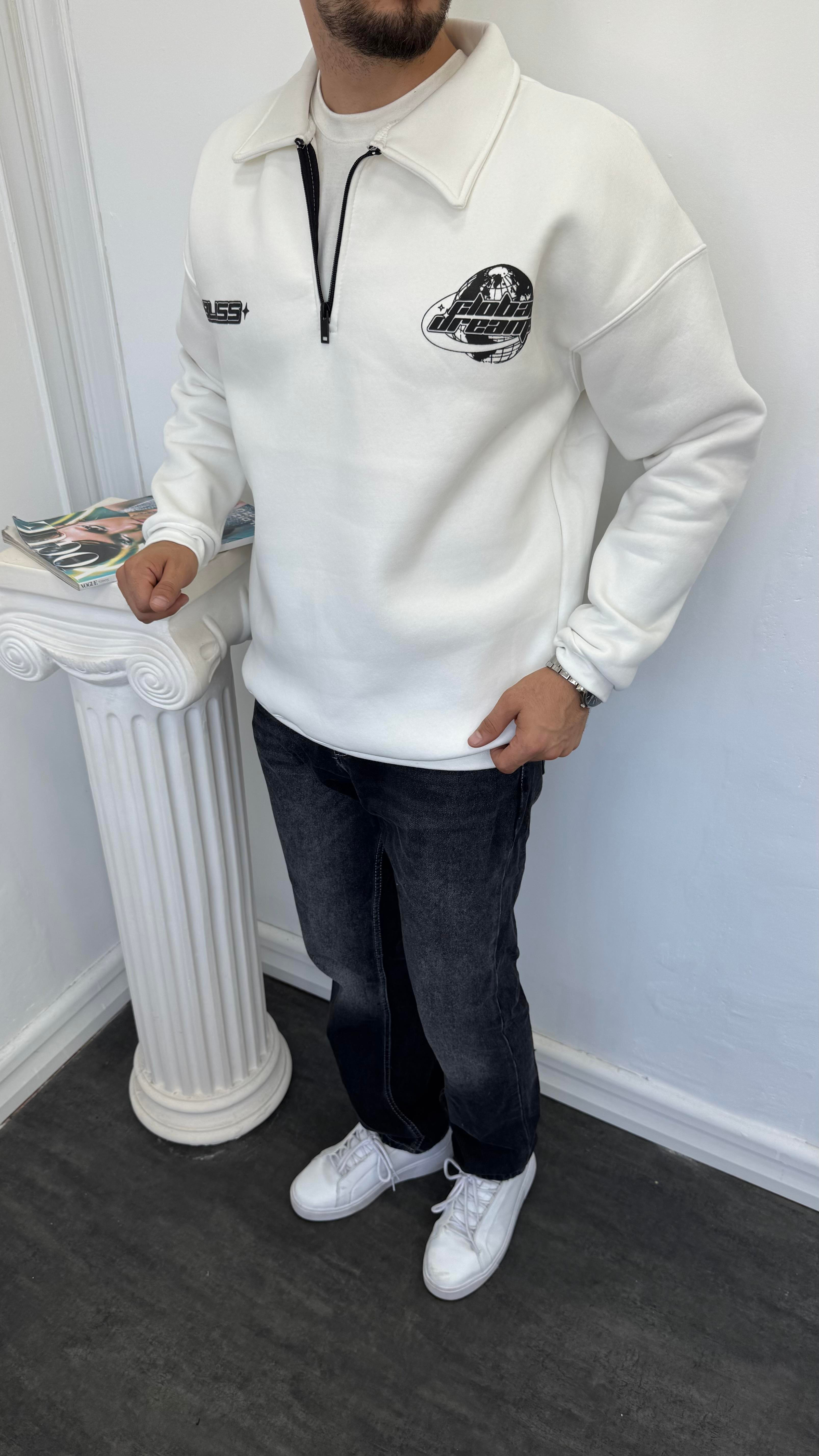 Polo Yaka Fermuarlı Şardonlu Sweatshirt Beyaz
