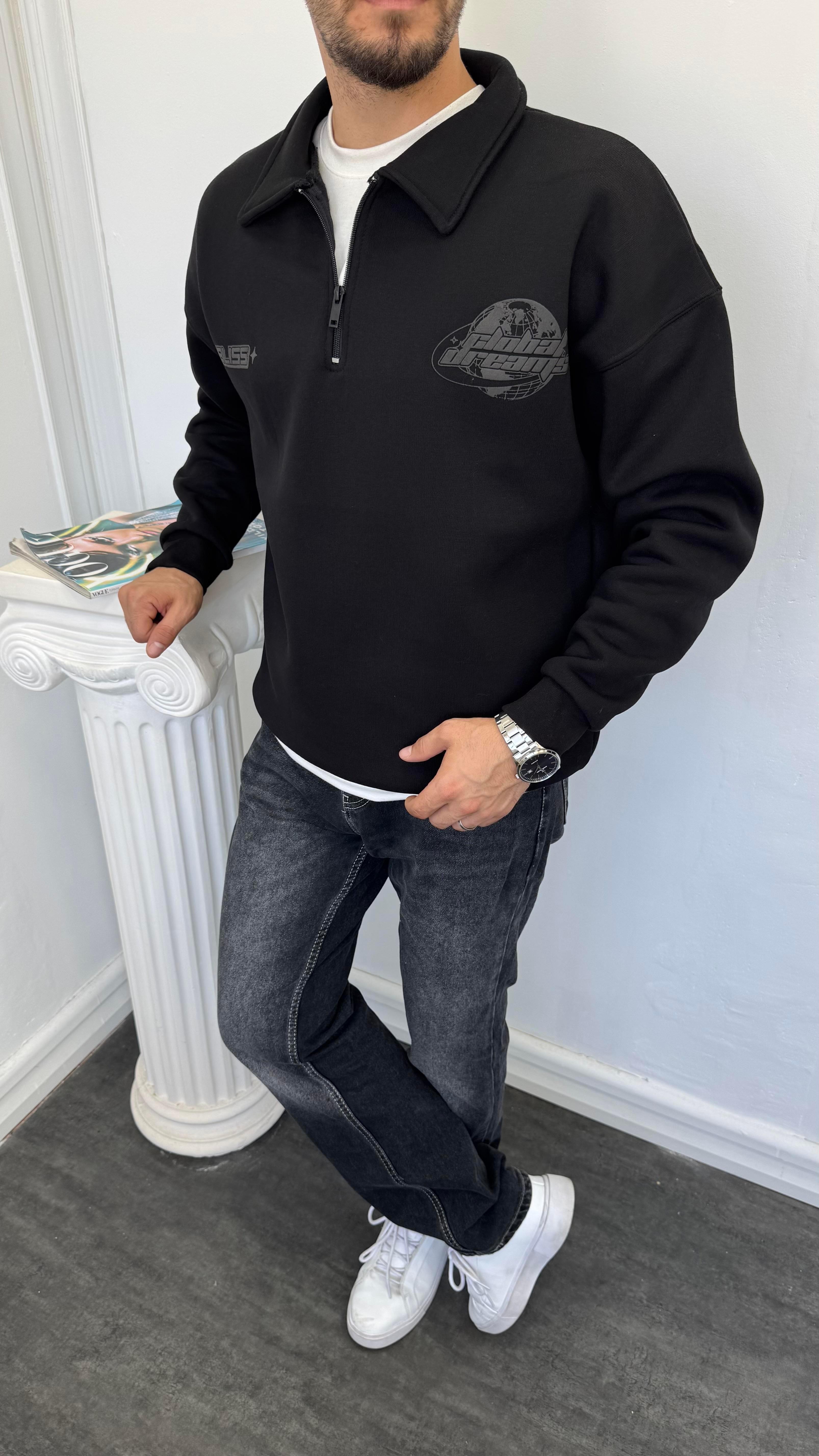 Polo Yaka Fermuarlı Şardonlu Sweatshirt Siyah