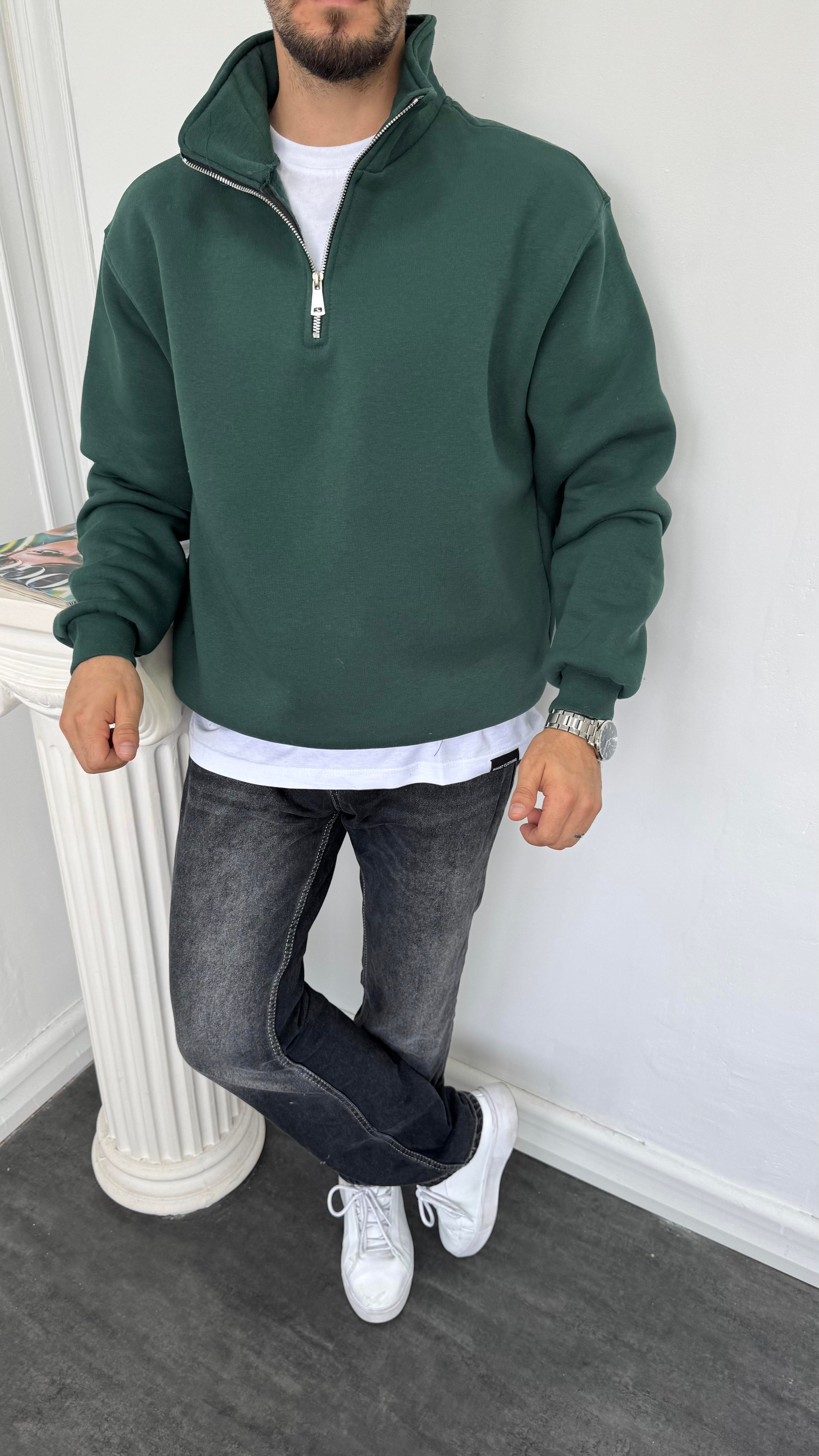 Yarım Fermuarlı Üç İplik Şardonlu Sweatshirt yeşil